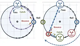 The figure describes a more complex situation where the tossed ball on a turntable bounces off the edge of the carousel and then returns to the tosser, who catches the ball. The effect of Coriolis force on its trajectory is shown again as seen by two observers: an observer (referred to as the "camera") that rotates with the carousel, and an inertial observer. The figure shows a bird's-eye view based upon the same ball speed on forward and return paths. Within each circle, plotted dots show the same time points. In the left panel, from the camera's viewpoint at the center of rotation, the tosser (smiley face) and the rail both are at fixed locations, and the ball makes a very considerable arc on its travel toward the rail, and takes a more direct route on the way back. From the ball tosser's viewpoint, the ball seems to return more quickly than it went (because the tosser is rotating toward the ball on the return flight).
