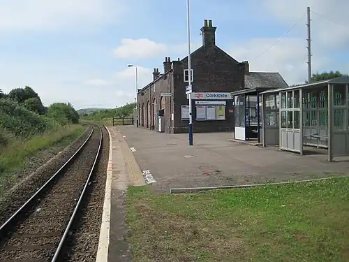 Corkickle railway station is a railway station serving the suburb of Corkickle near Whitehaven in Cumbria, England. It is on the Cumbrian Coast line, which runs between Carlisle and Barrow-in-Furness. It is owned by Network Rail and managed by Northern Trains. The station opened on 3 December 1855,[1] and is at the southern end of the 1,219 m (3,999 ft) tunnel from Whitehaven. Between 1855 and 1957, the station was known as Whitehaven Corkickle.[1][2]