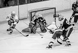 Cornell's history with ice hockey begins at the close of the 19th century, with the first organized game being played in March 1900 against the University of Buffalo.[8] Cornell was embarrassed in their first appearance, losing 1–10, but that didn't dissuade the school from pression forward. The next year in Philadelphia, the ice hockey squad played a total of three games over a four-day period, winning each contest. That weekend Cornell employed G. A. Smith as the team's coach but for the next eight years the club would go without. That was perhaps just as well as Cornell played four games over a three-year period, with each match being held at the St. Nicholas Rink in New York City, and was then mothballed for two years. The newly rechristened Big Red[9] returned in February 1907, playing a two-game set on campus for the first time. With no indoor or even artificial facility available all home games were played on Beebe Lake. This ended up being a rather poor arrangement since the ice hockey team would have to rely on good weather for their games until the second half of the century.
