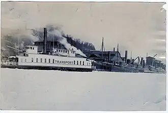 Cornell Steamboat Company rebuild entire boats, engines, and boiler in the Cornell complex. Thomas Cornell arrived at Rondout in 1837 and started a shipping company with his sloop. Cornell transported coal on the Delaware and Hudson Canal. Cornell also transported wood, stone, plaster, tanning bark, animal hides, millstones, glass, charcoal, lead, and stoneware. Cornell Steamboat Company also operated a fleet of river tugboats. By 1900 Cornell was operating 60 tugs and ended his passenger ship service.[7][8] Cornell also had a ferry service between Rhinecliff and Kingston Point/Rondout, the Kingston-Rhinecliff ferry. He has two ferries in his service the Transport (1881) and Kingston (1930).[9] The ferry ended in 1957 after the opening of the Kingston-Rhinecliff Bridge.[10] Transport ran on the ferry line from 1881 to 1938.[11] Cornell built and ran railroad lines on both sides of the Hudson River, including the Kingston City trolley system.[3] The Kingston Point station was the largest and busy trolley station.[12] Cornell was a partner is starting two banks (Rondout Savings Bank and a commercial bank) and the large Catskill Mountain hotel. Cornell served two terms in Congress from March 4, 1867, to March 3, 1869, and from March 4, 1881, to March 3, 1883. [13] S.D. Coykendall (1837-1913, Samuel Decker Coykendall), was son-in-law of Thomas Cornell and second president of the Cornell Steamboat Company. Mary Augusta Cornell (1842-1919) was Thomas Cornell Daughter.[14]