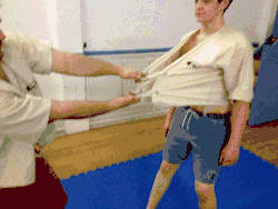 - The thrower moves their dominant foot in front of the throwee's dominant foot while pulling up the throwee's arm and tucking their dominant elbow into the throwee's armpit (keeping hold of the grips on the jacket).