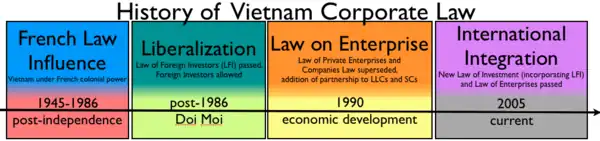 Corporate law in Vietnam is largely influenced by French laws due to its colonial past. After the 1954 Geneva Conference, Vietnam separated into two zones: the North and the South. In 1980, after the North took control of the South, the country adopted a centrally-planned economy, with officials discouraging private commerce.[5]