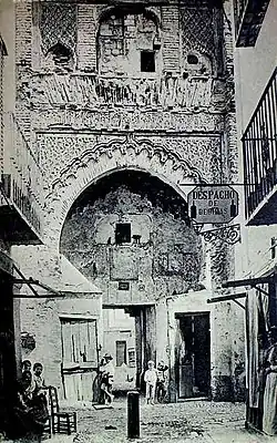 Its most notable feature is the monumental projecting entrance gateway, with the doors situated within a large iwan (a vaulted space open to one side, originating in ancient Sassanian architecture). The building's architectural form can thus be traced to Middle Eastern architectural models like those of Egypt and further east, where similar monumental entrances were more common.[3] A similar form is also found in the Gate of Justice (Puerta de la Justicia) at the Alhambra. The ornamentation of the facade, however, is more strictly Nasrid or Moorish. The alfiz (square frame) has featuring multilobed and interlacing arch motifs around the archway and carved arabesques filling the spandrels, as well as mocárabes (muqarnas) sculpting in the vault of the iwan above the doorway. Above the alfiz frame is a horizontal band with an Arabic Kufic inscription of Surah 112 of the Qur'an, and above this is a double-arched window.[5] On either side of the window are panels of decorative plaster carved with sebka and arabesque patterns. The projecting entrance is topped by a typical wooden eaves supported by corbels, as was typical of Andalusi and Moroccan architecture.[2]