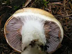 The cap is 5–10 cm (2.0–3.9 in) in diameter, initially spherical to convex, then flattened or depressed, at first with thin, involute margin, bearing fragments of veil when young. The cap surface is sticky and smooth, orangish-yellow, with a light ochre tint, and yellower at the edge than in the middle, where the color is more rusty yellow. The gills are crowded closely together, usually somewhat emarginate (notched), thin and not very broad (5–8 mm). They are initially a rich cornflower blue, to lilac then finally ochre-cinnamon, with slightly scalloped edge.[5]