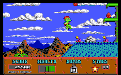 The player controls Cosmo, and the objective is to reach the exit of each level. Cosmo can walk and jump, and can hang onto most walls with his suction-cup hands. Combining the hanging and jumps allows Cosmo to climb to higher places. There are some interactive objects, including pushable ceiling buttons, teleporters, and springs that make Cosmo jump higher. There are also hovercraft (floating pads that allow Cosmo to fly) and hint globes (which cause a message to be displayed if Cosmo runs into one; destroying one with a bomb earns 12,800 points). The player has access to bonus levels after each level if enough stars are collected.