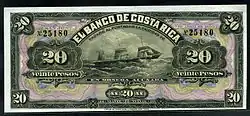 Private banks issued notes between 1858 and 1896. The first to issue notes was the Banco Nacional de Costa Rica. The first notes were 2 pesos, followed by 10, 20, 25, 50 and 100 pesos. The Banco de Costa Rica issued peso notes between 1895 and 1899, in denominations of 1, 2, 5, 10, 20 and 100 pesos. The Banco de la Union issued notes between 1877 and 1889 for 1, 2, 5, 10, 25, 50 and 100 pesos. The Ferro Carril de Costa Rica (Costa Rican railways) issued notes in 1872 for 10, 25 and 50 centavos, 1, 2 and 5 pesos.