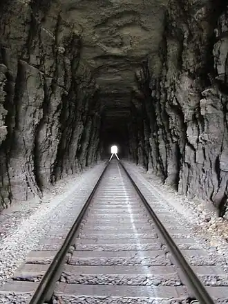 The Cotter Tunnel is a railroad tunnel located just outside Cotter, Arkansas. It carries the Missouri and Northern Arkansas Railroad under a ridge that U.S. Route 62 (US 62) traverses. The tunnel is 1,034 feet (315 m) in length and is cut through solid rock in a northwest–southeast direction. The southeastern portal has a sprayed concrete finish, while the northeastern portal is unfinished. The White River Division of the Missouri Pacific Railroad built the tunnel in 1903–04, and it was an important transportation link to the area at that time. The rail line continues to be used for active freight service.[2]