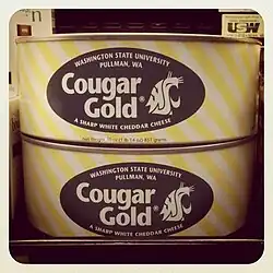 Cougar Gold is an American Cheddar cheese produced at Ferdinand's Creamery on the Washington State University campus in Pullman, Washington. Like other cheeses sold at the creamery, Cougar Gold is notable for being sold exclusively in 30 oz (850 g) tin cans.[1] Cougar Gold is a white, sharp cheddar that is aged at least one year. It has a nutty flavor somewhat resembling Swiss or Gouda. When properly refrigerated, Cougar Gold is claimed to last indefinitely in the can. An unopened can becomes more flavorful, sharp, dry and crumbly with age. Approximately 250,000 cans of Cougar Cheese are produced annually, with around 80% of it being Cougar Gold.[2]
