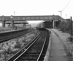 The situation of Coulsdon North on the so-called "fast track" of the Quarry Line posed pathing problems, as the route had to give priority to express services heading for the South Coast. Accordingly, through services to the coast were withdrawn, and the fast platforms saw only occasional use for special trains. Furthermore, the opening of Smitham (now called Coulsdon Town) in 1904 had created three stations in the same area and, by the 1960s, the decline had begun to set in.[2] Only the terminal platforms were regularly used, for stopping trains from Victoria or London Bridge. Weekend passenger services were withdrawn in 1965, the goods yard was closed in 1968, and from May 1970, passenger services only operated at peak hours on weekdays. The station finally closed in 1983 as part of the resignalling of the Brighton main line.[3]