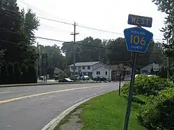 County Route 106 (CR 106) is a 7.8-mile (12.6 km) east–west county route in Rockland County, New York, in the United States. It serves as an eastward continuation of Kanawauke Road (former Orange CR 106), extending from the Orange County line to U.S. Route 9W (US 9W) and US 202 in Stony Point via Harriman State Park. CR 106 intersects with several county highways in Rockland County along the way. The route was only one of two in Rockland County to keep its numbering from Orange County, with the other being CR 72. CR 106 had one spur route, CR 106A, which was recently decommissioned.