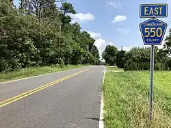 County Route 550 (CR 550) is a county highway in the U.S. state of New Jersey. The highway extends 15.92 miles (25.62 km) from Delsea Drive (Route 47) in Maurice River Township to Shore Drive (U.S. Route 9) in Dennis Township. The road travels through Maurice River Township (Cumberland County), Dennis Township (Cape May County) and Woodbine.