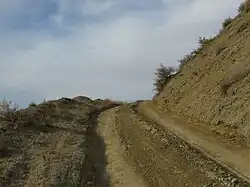 Dirt road tilts outward toward drop off