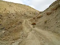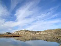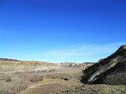 As for the old freight trail that went upstream from the mouth of Cow Creek, there is no longer any road to speak of in the first 15 miles. The multiple creek crossings of the old Cow Creek trail have been eroded away into cut banks, and the gravel bars where the wagons crossed have been swept down stream. Here and there the remnants of the old Cow Creek Trail can be observed along Cow Creek but it is sketchy.[9] Upper Cow Creek is not so isolated. About 15 miles up from the Missouri, where Davidson Coulee flows into Cow Creek, Blaine County Road 330 (Cow Creek Trail) drops down Davidson ridge to Cow Creek Bottom from the west. One ranch is located near this point. The name "Cow Island Trail" is still applied to the road that goes from the junction of Cow Creek and Davidson Coulee up to the bench and on to the west, and this is probably the same route that the original Cow Island freight trail followed as it went on to Ft. Benton. Above Davidson Coulee Cow Creek is paralleled by Blain County Road 314 (Birdtail Road) for about 6 miles (10 km). In the upper reaches of Cow Creek a County road (Birdtail Road) descends to a second ranch. Blaine County Road 300 crosses Cow Creek at it upper end, near the forks of West and East Cow Creek, just under the southern flank of the Bears Paw Mountains.[10]