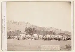 No permanent storehouses were erected at Cow Island. Once freight was offloaded at Cow Island, it was tarped and remained only briefly before being moved to Ft. Benton. The high profits on freight could only be realized once the goods had gotten to Ft. Benton.[5] A common outfit on the trail was 2 wagons, each pulled by six to eight oxen, with two bullwhackers. Oxen were preferred over horses and mules because they required less food and water, did not wander during storms, and "Indians didn't steal them because they couldn't ride them and they were to tough to eat".[5]