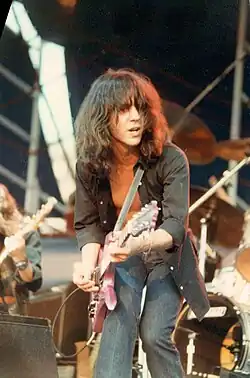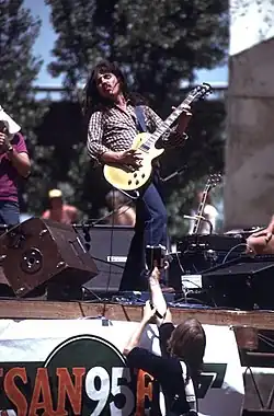 Chaquico's first guitar was a Winston acoustic which his mother bought for him when he was 10 years old after he'd given up his parents' idea that he would play an accordion.[25] He played a '57 Les Paul Goldtop on the first two Jefferson Starship albums and tours, Dragon Fly (1974) and Red Octopus (1975), on such songs as "Miracles".[7][26][27] He also soon added a rare '59 Les Paul Sunburst to his collection which he played on the next two albums, Spitfire (1976) and Earth (1978) and can be heard on such songs as "With Your Love", "Count on Me", and "Runaway".[27][28][29] Both Les Paul Guitars and the Bassman amps, along with several other valuable guitars, were stolen and/or destroyed in a riot in Lorelei, Germany, in 1978, when Grace Slick was unable to perform and the show was cancelled.[30][31][32] Into the '80s, Chaquico was sponsored by Carvin Guitars and often appeared on tour, in the studio and in guitar magazine ads playing a Carvin V220 or a Carvin koa doubleneck played through Carvin amplifiers, his favorite being the Carvin X100B.[33] Carvin released a Craig Chaquico Signature acoustic guitar, which continued to be produced after Carvin's evolution into Kiesel Guitars.[34]