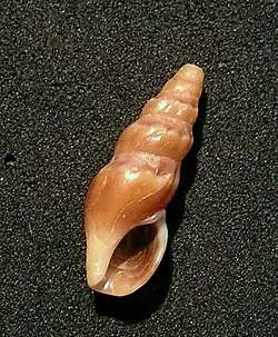 The smooth, turreted, narrowly claviform shell is reddish brown to uniform dark brown. It shows 7 moderately strong longitudinal ribs. It contains 7 obtusely angulated whorls, above the shoulder slightly concave, below almost convex. The spiral lirae are feeble. The aperture is oblong-ovate. The columella is upright and shows a slight callus on top. The outer lip is arcuate with a wide sinus and not deeply emarginate.[2]