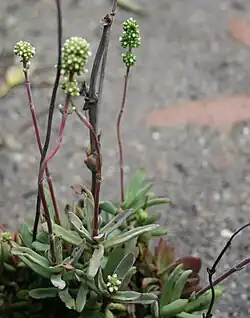 The peduncle emerges above the leaves of the rosette. The peduncle is 3-15 cm long, with one or two bract-pairs (not 15-40 cm long with 2-5 bract pairs like those of Crassula subacaulis). The tips of its 2-3mm long petals are roughly twice as long as they are broad, and have rounded appendages (not beaked/rostrate like those of Crassula atropurpurea).