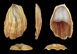 • The apex is low and near the margin of the shell, curved to one side and not markedly hooked (rather than high, hooked and centrally placed),