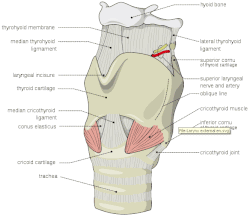 A cricothyrotomy (also called cricothyroidotomy or laryngotomy) is a medical procedure where an opening is created through the cricothyroid membrane to establish a patent airway during emergency airway management. Cricothyrotomy is primarily performed as the last step in airway management algorithms in cases where an airway cannot be established by other means of nasal or oral tracheal intubation.[1][2] These situations, often referred to as "cannot intubate, cannot ventilate" (CICV) or "cannot intubate, cannot oxygenate" (CICO), are commonly seen as a result of airway obstruction, angioedema, trauma, burns, or abnormal anatomy.[3]