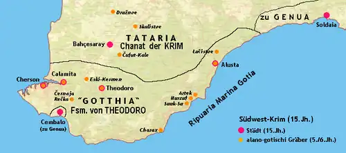 2. ^ Wolfram, Herwig (1990) [1979]. History of the Goths. European history/Medieval studies/Classical studies. Translated by Dunlap, Thomas (revised ed.). Berkeley: University of California Press. p. 79. ISBN 9780520069831. Retrieved 13 December 2022. Theodoric the Great wished the Crimean Goths to join his army on the march to Italy, but they declined with thanks.