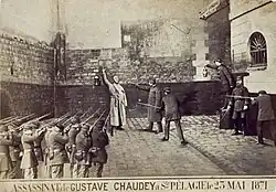 Finally, these photomontages take considerable liberties with historical facts. The execution of the hostages at the Roquette prison was indeed ordered by Théophile Ferré on May 24, 1871, but he was not present at the scene, contrary to what Appert's image suggests.[40] The scene is silent on the confusion of the moment, and the Communards' determination to prevent the execution.[41] The Rue Haxo hostages were not executed all at once, as the photomontage shows, but in small groups, in great confusion.[12] More significantly, Generals Thomas and Lecomte were shot one after the other, summarily and by the angry: Appert's photomontage, itself inspired by an engraving in L'Illustration, gives the impression of a joint execution by an organized platoon, as if implementing a decision of the Paris.[40]