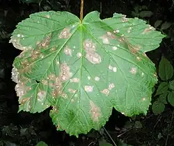 The fungus develops on the surface of the leaf blades. At first there are scattered water-soaked grey spots about 1 mm (0.04 in) in diameter, but as the disease progresses, these lesions expand and coalesce and much of the leaf surface may be affected. Fruiting bodies resembling tiny white pinheads develop on either the upper or lower side (or both) of the leaf, particularly near the veins. Small black sclerotia may also form. At some stage the leaves wilt and eventually fall prematurely.[2] In the Polish study, many of the affected host trees had characteristic pigmentation of the necrotic areas, with the centre and periphery of the lesions differing.[4]