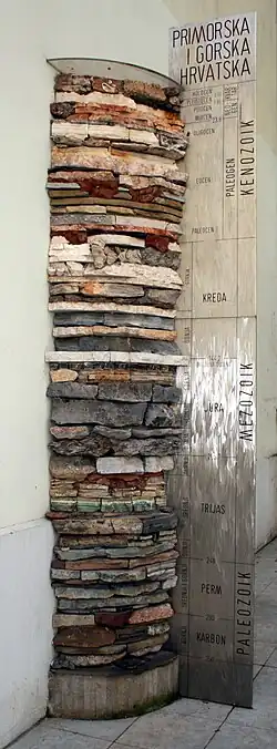 The atrium of the museum contains two exhibits: the Rock Map of Croatia (Kamenospisna karta Hrvatske) and the Geological Pole (Geološki stup). The Rock Map of Croatia is a mosaic map assembled from various pieces of rock found in Croatia into the country's shape.[24][25]