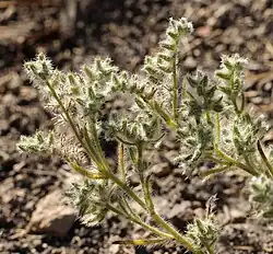 It is an annual herb producing a branching stem 10 to 35 centimeters tall covered in stiff hairs. The hairy to bristly leaves are up to 4 centimeters long. The inflorescence is a linear array of developing fruits with a dense clump of open flowers at the tip. The bristly white five-lobed flowers are 3 or 4 millimeters wide.
