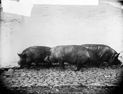 Pigs are part of the mixed farming economy. Traditionally every farm kept a Welsh pig as part of the staple diet.[8] During the winter, the main source of meat was cured ham and bacon from pigs raised on the farm.[2] Hams were cured in the large chimneys of farm kitchens, which slowly dried the ham and bacon after it had been salted.[2] This tradition has largely died out, but the remaining producers make hams which are similar to Bayonne, Serrano, or Parma hams.[10] Freshly cured ham is sliced for grilling, older ham is boiled as a York ham, and ham cured for many months is sliced wafer thin, like Parma ham. Carmarthen ham has a similar farmyard flavour. The hocks have the greatest flavour, and need to be boiled a long time to soften the meat. They make a good base for winter stew, or a summer ‘paysanne’ salad.[2] Dry-cured Carmarthen Ham can be found at Carmarthen Market. Six generations of the Rees family have sold ham here [11] spanning 200 years.[12] and their family were the first commercial producers of dry-cured ham in Britain.[8] Carmarthen Ham is dry salt-cured and then air dried and sold whole boneless, or sliced thinly and vacuum packed.[11] It is believed that when the Romans settled in Carmarthen they acquired the recipe and on their return to Italy called it Parma Ham.[11] The ham is cut in thin wafers and is served like prosciutto or Parma ham, but is saltier.[3] Carmarthen Ham production remains a cottage industry, in order to keep it a premium product.[11] Carmarthen Ham is a particular favourite of King Charles III.[12] The Rees family also produce a short back and streaky bacon. This is dry-cured for one week and hung for a further three weeks. It is recommended that the bacon is blanched before frying to remove any excess salt.[2] The Rees family have more than 80 hams curing at any one time,[13] and it takes nine months to cure [13] they also have a mail order business and travel to the nearby markets of Brecon, Fishguard, Haverfordwest, Pembroke and Cardigan.[3]
