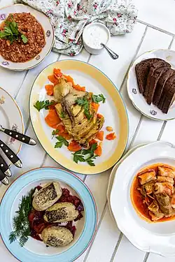 Among cold appetizers, vorschmack is especially popular, as well as a dip made from grilled aubergines.