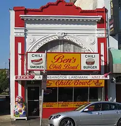 D.C. is the birthplace of the half-smoke,[28] which is a half-pork, half-beef sausage, typically placed in a hotdog-style bun and topped with chili, onions, and mustard. Half-smokes are sold at numerous locations throughout the D.C. region, but are most notably sold at the city's landmark restaurant, Ben's Chili Bowl. Mumbo sauce is a D.C.-area condiment that is a mix of sweet barbeque and ketchup sauce, often placed on meat or French fries. Washington is also the birthplace of jumbo slice pizza, which is an enlarged New York-style pizza. Jumbo slice pizza is particularly popular in the Adams Morgan neighborhood.[29]