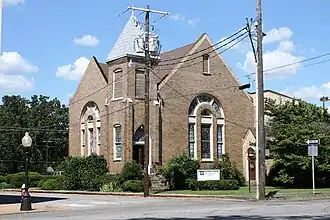 The Cumberland Presbyterian Church is a historic church at the junction of Race and Spring Streets in Searcy, Arkansas. It is a single-story buff brick Romanesque Revival structure, with a cross-gable roof configuration and a square tower at the right front corner. The tower houses the main entrance in a pointed-arch recess, and has a louvered belfry at the second level below the pyramidal roof. The church was built in 1903 for a congregation organized in 1824, and is a fine example of Romanesque and Classical Revival architecture.[2]