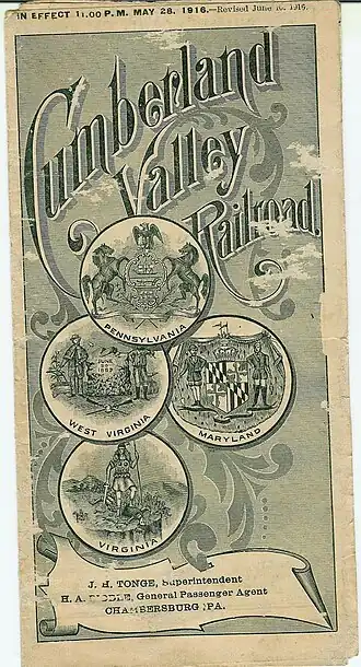During the American Civil War the line had strategic importance in supplying Union troops in the Shenandoah Valley. It also ran the first passenger sleeping car in the U.S. on the Chambersburg-Harrisburg route in 1839.[4][5] The Pennsylvania Railroad (PRR) gained control of the CVRR as early as 1859, and officially purchased it on June 2, 1919. The PRR's successor, the Penn Central, closed all railway facilities in Chambersburg in 1972 and its successor, Conrail, abandoned major pieces of the line in 1981.