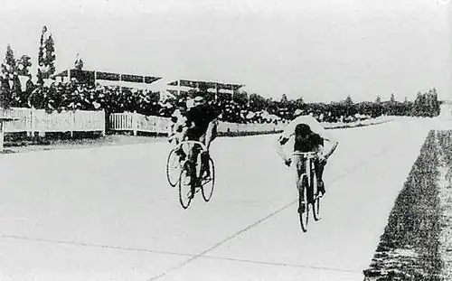 Unlike modern sprint events (which use a flying 200 metre time trial to cut down and seed the field, followed by one-on-one matches), the 1900 sprint used very large initial heats of up to eight cyclists each before smaller quarterfinals, semifinals, and final with three cyclists in each race. For the first round, the top three cyclists in each heat advanced; in the quarterfinals and semifinals, only the fastest man moved on. The distance for each race was 1 kilometre.[1]