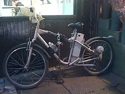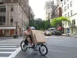 Delivery bikes are commonly used in New York for fast food deliveries over short distances, sometimes using mountain bikes outfitted with a wide carrier for larger loads such as pizza or other accessories. Bicycle messengers use narrower wheels to carry lighter loads short distances. Specialized cargo bicycles and tricycles carry heavier loads. Electric bicycles are increasingly used for this service; the bikes were initially illegal (although enforcement was sporadic), but legalized in 2020.[18] Proposals in the New York State Legislature in 2015 would define, legalize and regulate certain "electric assist bicycles" with small electric motors.[19]