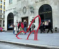In 2008, David Byrne designed a series of bicycle parking racks in the form of image outlines corresponding to the areas in which they were located, such as a dollar sign for Wall Street and an electric guitar in Williamsburg, Brooklyn.[59] Byrne worked with a manufacturer who constructed the racks in exchange for the right to sell them later as art. The plans were accepted by New York City Department of Transportation and installed in NYC between July 2008 and July 2009.[60]