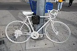 When mayor Bill de Blasio entered office in 2014, he sought to bring all traffic fatalities to zero through his Vision Zero initiative.[88] In 2017, 24 cyclists were killed, and 4,485 were injured in crashes in New York City.[89] A map of fatal crashes and injuries is available on a Vision Zero View website.[90] Some fatality locations are marked by white-painted ghost bikes.[91] Although crash-related injuries to cyclists are not uncommon, their incidence has decreased even as the number of cyclists in New York City has increased. Between 2011 and 2015 there were 12.8 cyclist fatalities per 100 million cycling trips, compared with 44.2 cyclist fatalities per 100 million cycling trips between 1996 and 2000.[92]