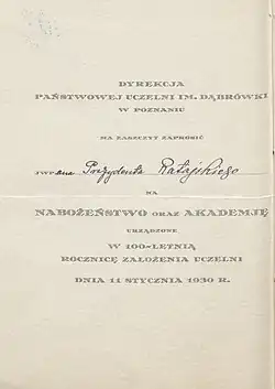 Throughout most of the interwar period Dąbrówka was one of two public[17] and one of five female high schools in Poznań in general;[18] it was also the most prestigious one. The establishment was entirely Polish in terms of instruction language and general outlook. There is no information on groups with German, which must have disappeared in the early 1920s; later memoirs of Polish students only exceptionally refer to German colleagues. German textbooks and manuals were gradually being replaced with Polish ones. In terms of religion the school was clearly a Roman Catholic one and none of the sources notes presence of Protestant ministers. Until the late 1920s the overall number of students hovered around 800.[19] Once a neo-humanist division was set up in 1929[20] - since 1936 operational as entirely separate Państwowe Gimnazjum Żeńskie im. Klaudyny Potockiej[21] - the number of girls probably decreased slightly.