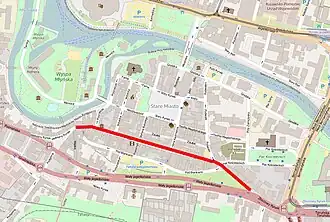 The street is located in the heart of the Old Town. It extends approximately on an east–west axis, from the Zbożowy Rynek ("grain market") near southern tip of Bernardyńska Street to Wool Market square (Polish: Wełniany Rynek). It is approximately 650 metres (2,130 ft) long.