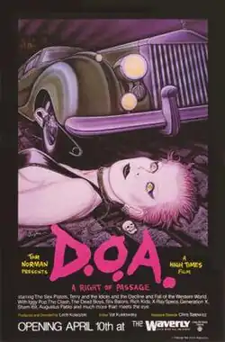 D.O.A.: A Right of Passage is a 1980 rockumentary film directed by Lech Kowalski (his premiere film as a director) about the origin of punk rock. The rockumentary takes interview and concert footage of some of punk rock's earliest bands of the late 1970s scene. It features live performances by the Sex Pistols, The Dead Boys, Generation X (with Billy Idol), The Rich Kids, X-Ray Spex, and Sham 69, with additional music from The Clash, Iggy Pop, and Augustus Pablo.[1][2]