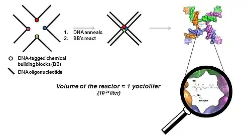 In 2001 David Liu and co-workers showed that complementary DNA oligonucleotides can be used to assist certain synthetic reactions, which do not efficiently take place in solution at low concentration.[24][25] A DNA-heteroduplex was used to accelerate the reaction between chemical moieties displayed at the extremities of the two DNA strands. Furthermore, the "proximity effect", which accelerates bimolecular reaction, was shown to be distance-independent (at least within a distance of 30 nucleotides).[24][25] In a sequence-programmed fashion oligonucleotides carrying one chemical reactant group were hybridized to complementary oligonucleotide derivatives carrying a different reactive chemical group. The proximity conferred by the DNA hybridization drastically increases the effective molarity of the reaction reagents attached to the oligonucleotides, enabling the desired reaction to occur even in an aqueous environment at concentrations which are several orders of magnitude lower than those needed for the corresponding conventional organic reaction not DNA-templated.[26] Using a DNA-templated set-up and sequence-programmed synthesis Liu and co-workers generated a 64-member compound DNA encoded library of macrocycles.[27]