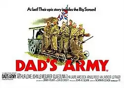 Dad's Army is a 1971 British war comedy film directed by Norman Cohen and starring Arthur Lowe, John Le Mesurier, Clive Dunn, John Laurie, Arnold Ridley, Ian Lavender and James Beck.[2] It was written by Jimmy Perry and David Croft and was the first film adaptation of the BBC television sitcom Dad's Army (1968–1977). It was filmed between series three and four and was based upon material from the early episodes of the television series. The film tells the story of the Home Guard platoon's formation and their subsequent endeavours at a training exercise.