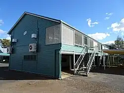 The intermediate wing was a highset timber school building with semi-enclosed stair. From the early 1950s the Department of Public Instruction introduced and developed new standard plans for school buildings, which were similar to the Boulton & Paul buildings but not prefabricated.[50] These buildings were also highset timber-framed structures with the understorey used as covered play space. The principal type was a long and narrow building with a gable roof.[51] A semi-enclosed stair connected the understorey to a north facing verandah running the length of the building, with full height timber verandah posts that extended from ground level to the roof line. Classrooms opened off the verandah and had extensive areas of windows; almost the entirety of the verandah wall and the opposite classroom wall were glazed – with awning (top-hung) windows to the southern elevation, and double-hung sashes to the verandah wall. This type was the most commonly constructed in the 1950s in Queensland.[52][1]
