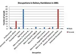 In 1881 the dominant occupation was in agriculture with 40 males in that profession. In 2011 this had changed to 32 males becoming Managers, Directors and Senior Officials in Dalton.[9] In 1881 the main profession for females was domestic services or offices, by 2011 this had changed to 16 women being Managers and Senior professionals.[10]