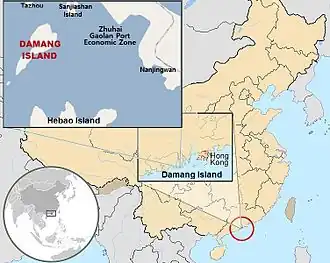 Damang Island (alternatively romanized as Damang Dao,[1] Damang,[2] Taimong,[3] Ta-mang,[4] Ta-wang[5]) is an uninhabited island off the southern coast of Guangdong province in the People's Republic of China. It is located in the Pearl River estuary, South China Sea, 6 kilometres (3.7 miles) west of the Zhuhai Gaolan Port Economic Zone, 4.5 kilometres (2.8 miles) north of Hebao island and approximately 100 km west-southwest of Hong Kong.