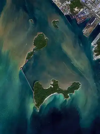 Damang Island (top) in 2021. Breakwaters connecting the island and Hebao Island (bottom) was completed by 2012.