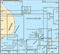 The area is described in NGA Pub. 161, Sailing Directions (Enroute) South China Sea and the Gulf of Thailand.[1] The navigational charts and sailing directions do not completely agree with each other as to the boundary. For example, the Sailing Directions include most of the NW area shown on Chart 93044 as outside of Dangerous ground, but exclude the Reed Bank, which is shown on Chart 93045 as inside Dangerous Ground.