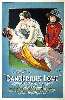 Dangerous Love is a 1920 American silent Western film based on the 1917 novel Ben Warman by Charles E. Winter, who would later become a congressman for Wyoming.[1] The film was directed by Charles Bartlett, and stars Pete Morrison, Carol Holloway, Ruth King, Jack Richardson, and Spottiswoode Aitken. The movie was shot at the Lakeside Studios in Denver, Colorado. The feature had previously been announced under several titles before its release, including The Vanishing Strain, Ben Warman, A Good Bad Man, and Broken Promises.[2]