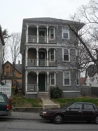 The Daniel Hunt Three-Decker is a historic triple decker house in the Main South neighborhood of Worcester, Massachusetts. It is well preserved representative of the housing boom that took place in the area in the 1880s and 1890s, with significant early Queen Anne styling. It was built in 1890, and its first owner was Daniel Hunt, a machinist who lived next door. The building follows a typical side hall plan, with a side wall jog and an asymmetrical facade. The left side is a row of porches with turned balusters and posts, and the right consists of a bay that projects the full depth of the porch. The roof is a shallow hip roof, with an extended eave that has curved support brackets.[2]