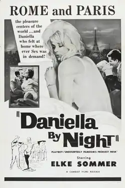 Daniella by Night (French: De quoi tu te mêles Daniela!, German: Zarte Haut in schwarzer Seide) is a 1961 French-West German spy thriller film directed by Max Pécas and starring Elke Sommer, Ivan Desny and Danik Patisson. It was based on the novel Daniela by Walter Ebert.[1] It was Sommer's first of several spy films, but was largely an exploitation film featuring several nude scenes.[2]